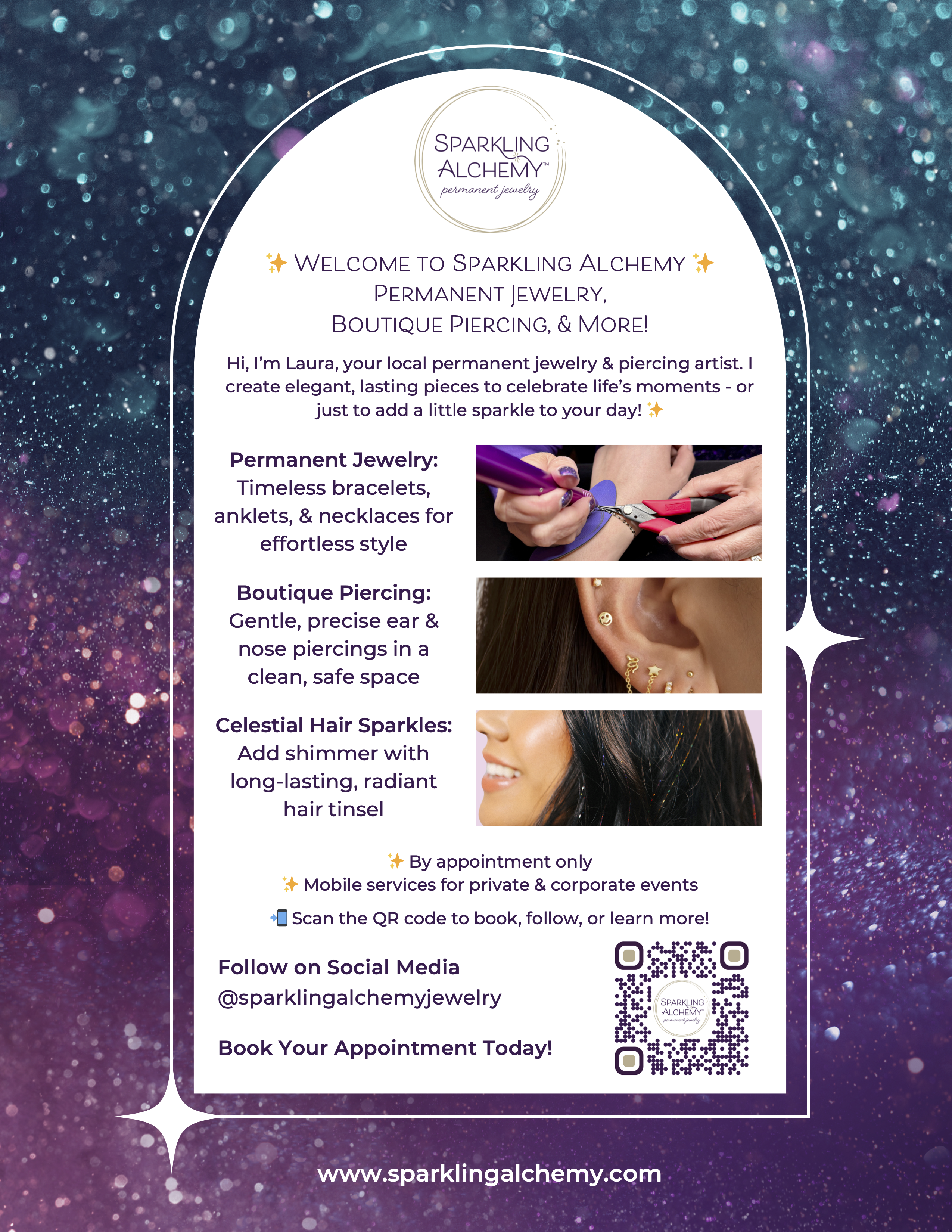Sparkling Alchemy® offers luxury permanent jewelry, boutique-style ear and nose piercing, and mobile jewelry services in Northglenn and the Denver/Boulder metro area. Open by appointment, we specialize in custom-fit welded bracelets, necklaces, and anklets, as well as elegant piercing. We create meaningful, radiant moments through private Sparkle Sessions, home parties, corporate events, and destination celebrations.